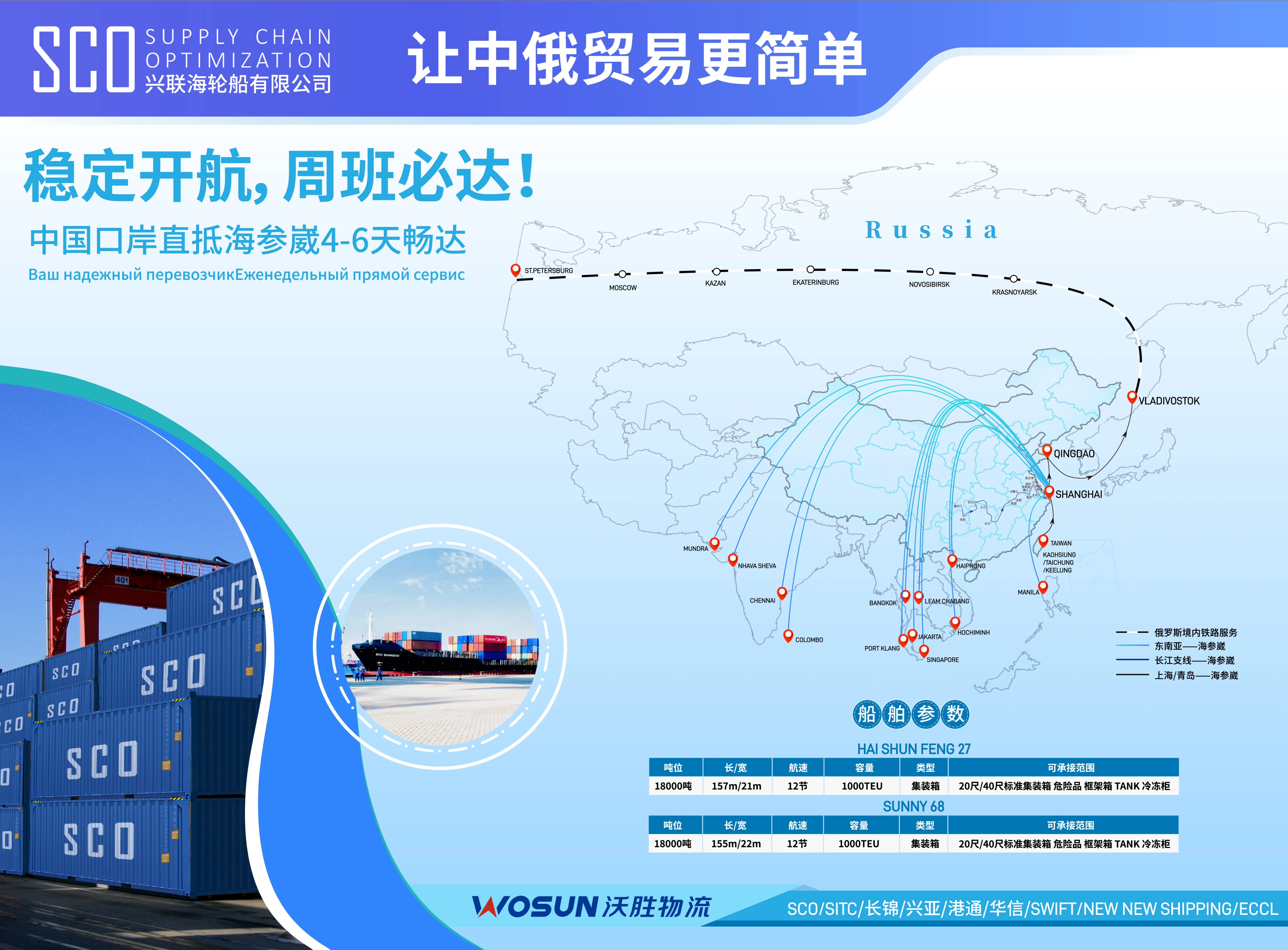 公司致力于俄羅斯遠東港口的集裝箱及散貨海運市場。(1)進出口集裝箱運輸:擁有專業的操作團隊,與馬士基、KMTC、現代海運、FESCO、長錦等船公司建立長期穩定的合作關系,在訂艙、港口操作、國際聯運領域占據領先地位。(2)進出口散貨及件雜貨運輸 :浩通國際物流立足海參崴,與VMTP、VMPP、FISHPORT等,港口碼頭深度合作,在中俄之間首家組織散糧運輸,同時積極開展散貨及件雜貨運輸、裝卸、疏港業務。